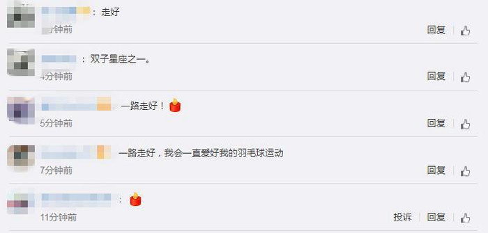 韩爱萍离世的消息被报道后,蔡赟、王琳等前国羽名将发文悼念缅怀,网友得知这一消息也都纷纷留言纪念。