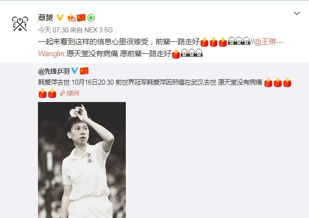 前国羽队员蔡赟和王琳在微博哀悼。