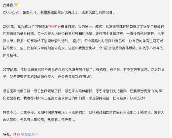 “我把一切都献给了这项热爱的运动。”这是林丹在自己的退役告别中所说的。