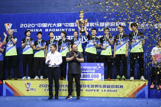 2020年9月14日,在四川成都举行的2020中国羽毛球俱乐部超级联赛第二阶段淘汰赛决赛中,青岛仁洲队以3比0战胜瑞昌碧源队,夺得冠军。新华社记者 王曦 摄