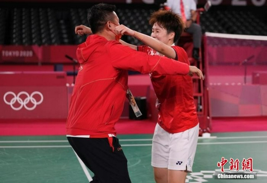 陈雨菲和教练相拥庆祝。中新社记者 杜洋 摄