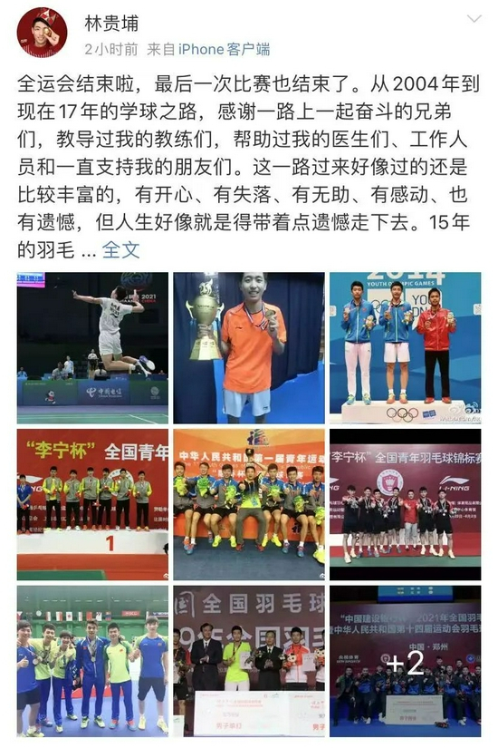 林贵埔表示:全运会结束啦,最后一次比赛也结束了。此前林贵埔在全运会的团体比赛中表现的不尽如人意,两次与石宇奇交锋,先后以0:2、1:2的分数输给石宇奇。在9月13日16进8的比赛中以0:2的分数不敌陆光祖,结束了自己最后一次羽毛球比赛!