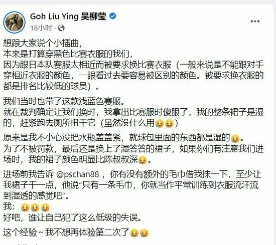 对此,吴柳莹在社交平台对此事作出说明。她写道:“想跟大家说个小插曲,本来是打算穿黑色比赛衣服的我们,因为跟日本队赛服太相近而被要求换比赛衣服(一般来说是不能跟对手穿相近衣服的颜色,一眼看过去要容易被区别的颜色。被要求换衣服的都是排名比较低的球员)。“
