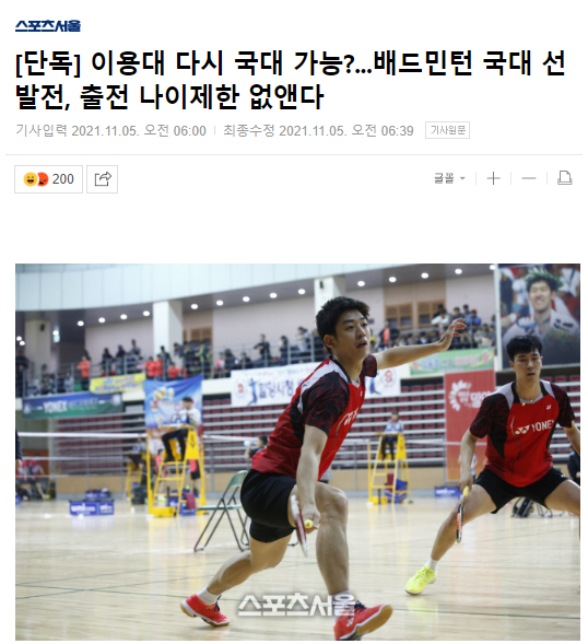 《首尔体育报》今天报道说,韩国羽毛球协会将会对年龄限制进行裁撤。