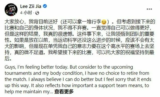 李梓嘉后在社交平台表示:大家放心,我背目前还好(还可以拿一堆行李)。但考虑到接下来的比赛和自己的身体状况,我不得不弃赛。一直觉得自己可以做得更好,但是这样的结果,我真的很遗憾。