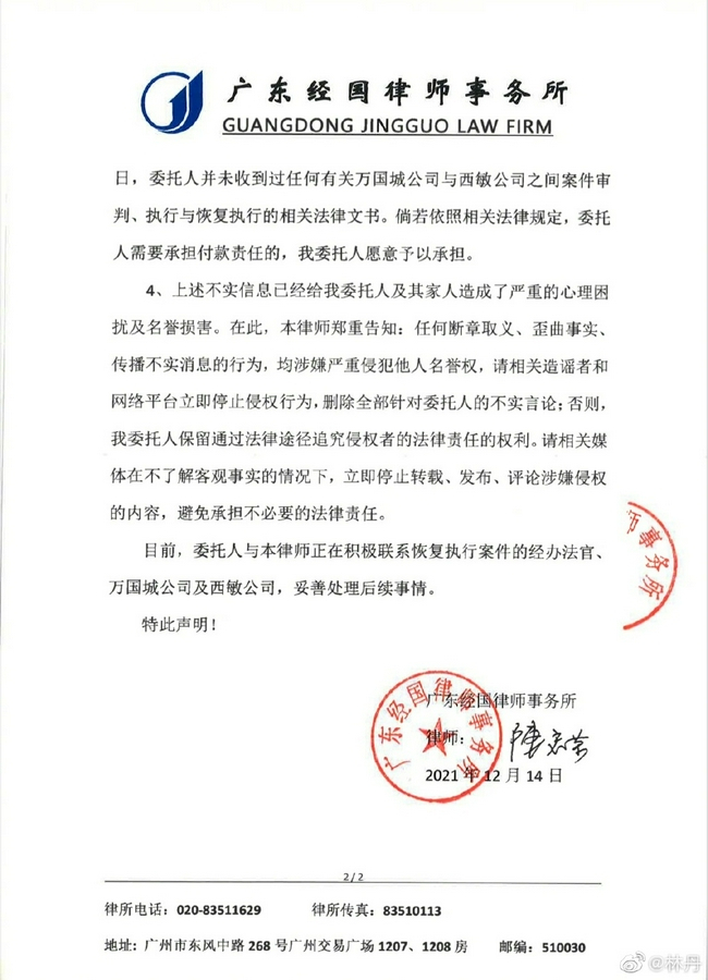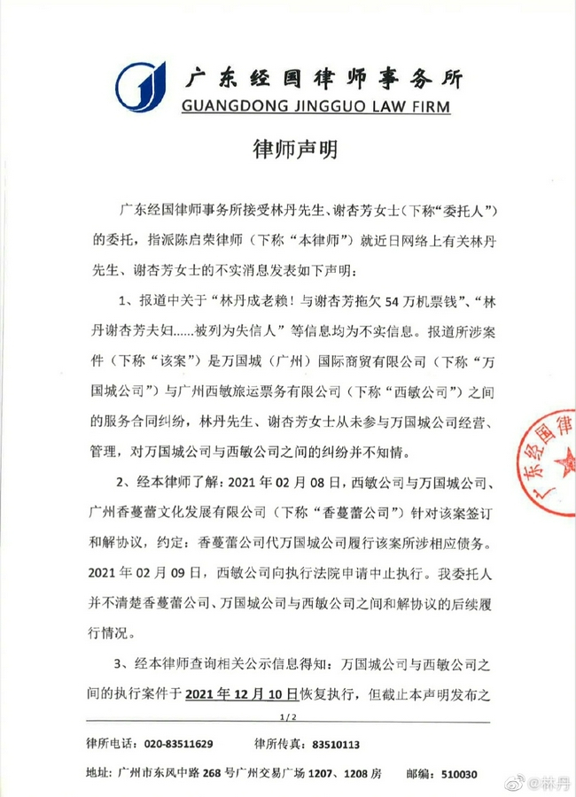 2020年,万国城公司被列为失信被执行人。法院在执行异议公告中,追加林丹等为被执行人。不久,该案成为终本案件。今年12月,该案恢复执行。另据万国城公司变更记录显示,今年3月,林丹退出该公司股东行列。