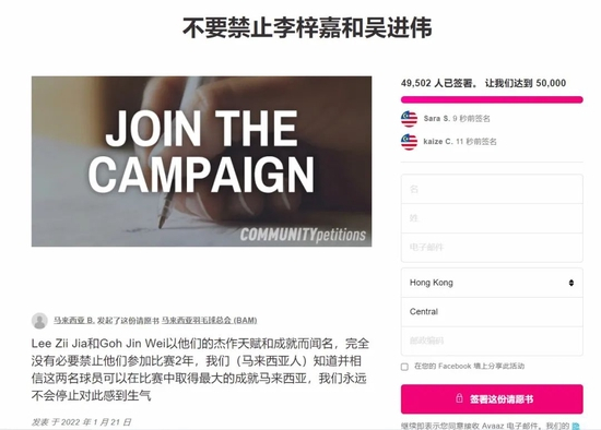而李吴的好友、大马男双好手苏伟译也在IG分享这个请愿书的链接,呼吁大家支持。