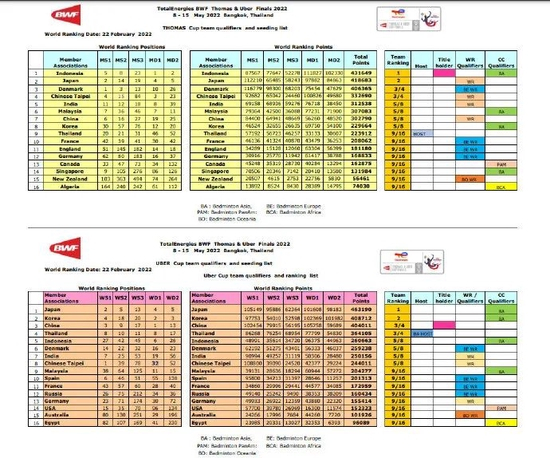 2022年2月25日,世界羽联正式公布了2022年汤姆斯杯暨尤伯杯羽毛球团体赛参赛队种子顺位,国羽分列汤姆斯杯第7位尤伯杯第3位。