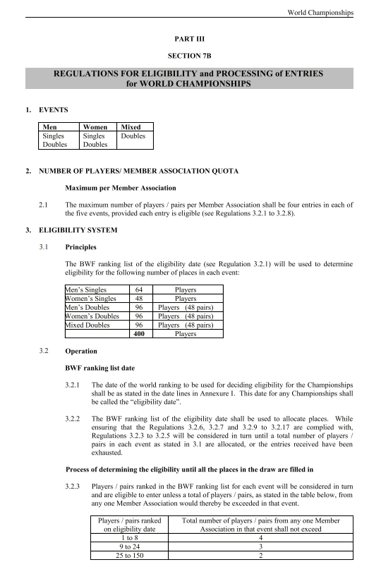 世界羽联关于各协会世锦赛参赛资格的主要规定是:每个国家、地区(协会)最多只能派出各四名或四对选手参加各单项角逐,其中男单不超过64人,女单不超过48人,男双、女双、混双不超过48对。主要邀请依据是资格截止日期前各国家、地区(协会)排名1-8有4人(对或以上)可以参加4人(对),排名9-24有3人(对或以上)可以参加3人(对),排名25-150有2人(对或以上)可以参加2人(对),世界羽联将在积分排名截止日前依据排名高低和邀请规则,分阶段向各国家、地区(协会)发送邀请函,各国家、地区(协会)予以确认。后续阶段世界羽联根据排名高低依次递补邀请。