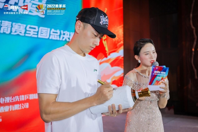 在晚宴现场,张楠还在赖茅世界羽联合作纪念酒上签上了自己的名字,作为冠军奖品赠与冠军球队,这份颇具仪式感的奖品让冠军奖杯上又添加了一份荣光。除此之外,组委会还颁发了优秀赛区奖,杭州光度能量羽毛球馆、宁波兴明潘火羽毛球馆、泉州兴东海AI羽毛球馆获此殊荣。