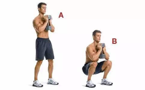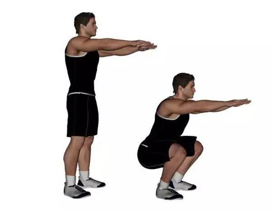 双脚打开约与肩同宽,双手向前平举延伸,臀部后推下蹲,想像要坐在椅子上,深蹲过程尽量放慢,直至大腿平行地面再回推身体呈站姿。若想加强训练强度,可双手托哑铃,进行负重深蹲。