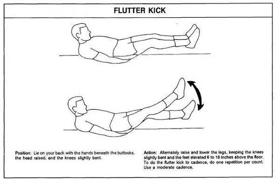 仰躺于地面,一样建议先在身下铺张瑜珈垫或软垫,双手贴于臀部下方,利用腹部力量将双脚及上身略微撑起,双脚上下交叉移动如打水姿势。