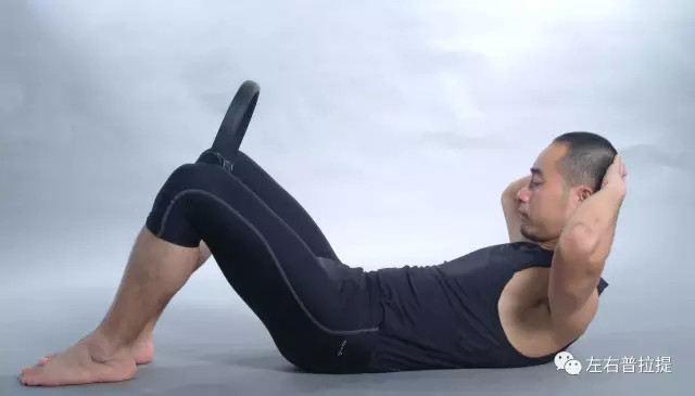 2、吸气;在呼气时,收缩腹部,将头部和肩部卷离垫子,直至肩胛骨下角刚触及地面。