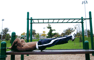 双手抓住固定物,身体绷成一条直线。双脚向上,直至身体几乎跟地面垂直,肩胛骨仍留在长凳上。保持身体成一直线,然后慢慢放下双腿,直至它们仅仅刚刚离开长凳,然后再次将双腿抬起至与地面垂直。