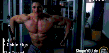 动作二,站姿绳索低位夹胸,训练时利用重量逐渐递减方式完成训练,使用中等重量递减掉到轻重量为一组,先利用中等重量做15-10次然后不休息递减重量再做15-10次为一组,也就是说中等重量和轻重量各做15-10次为一组。训练时健身者一定要注意动作的速度,速度太快会直接影响训练效果无法达到良好的刺激效果,所以一定 要保持慢速收缩训练。