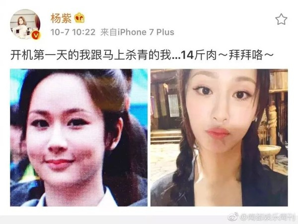 终于,爱粉们心里的大石头在前几天她的一条微博中,落下了地。小猴紫主动放出了一张进组前和进组后的对比照,只见她尖尖的小脸蛋和扑扇扑扇的大眼睛,萌力十足。一句话总结:瘦下来的小猴紫真的好美啊!