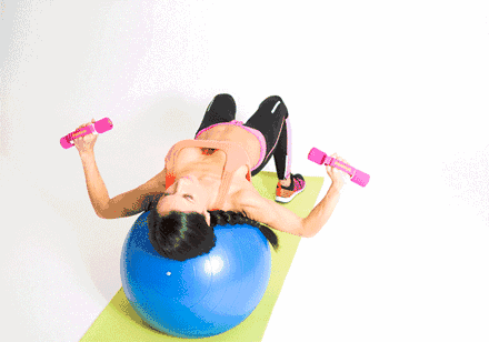 上身平躺在瑜伽球上,下身保持平衡脚部撑地。手握哑铃双臂伸直哑铃相碰,然后向下做扩胸运动。
