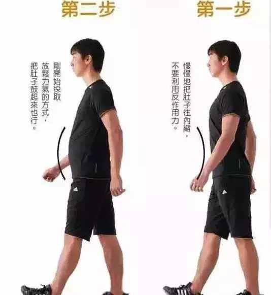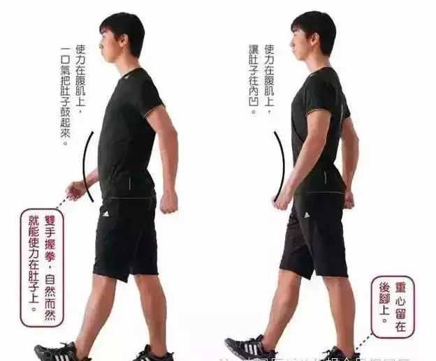 收腹、抬头挺胸、肩膀轻松下压、臀部夹紧、脚跟先着地、目视前方、下巴自然微收,同时配合“一吸一吐”的呼吸。