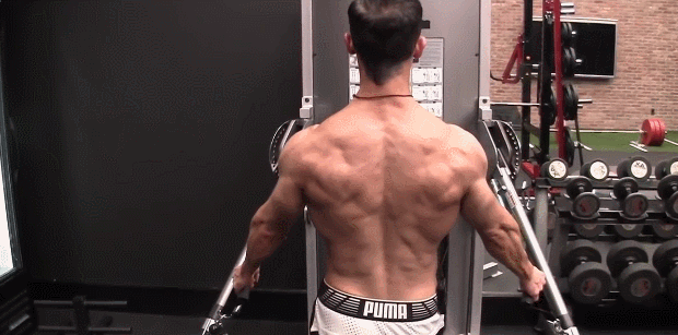 第三种方式是用伸展后的姿势来训练,我们要让肌肉收缩,但是换成前侧链,所以是腹肌和二头肌,胸肌和肩膀,我么你要把滑轮设定在下放,抓住两边,再往前踏一步,这样非常安全。
