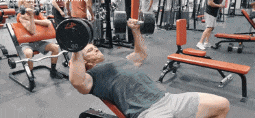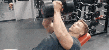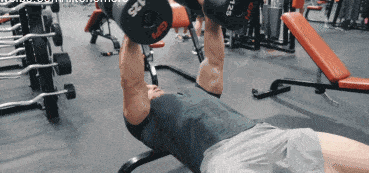 动作3,哑铃上斜卧推,这个动作主要是针对上胸肌的强化,如果你的上胸肌比较弱,可以多利用上斜卧推来强化,这个动作与动作1一样都要做有旋转手腕的过程,这样可以增加训练强度,同样三角肌前束和肱三头肌力量弱的朋友建议不要使用大重量训练。每组做10次。