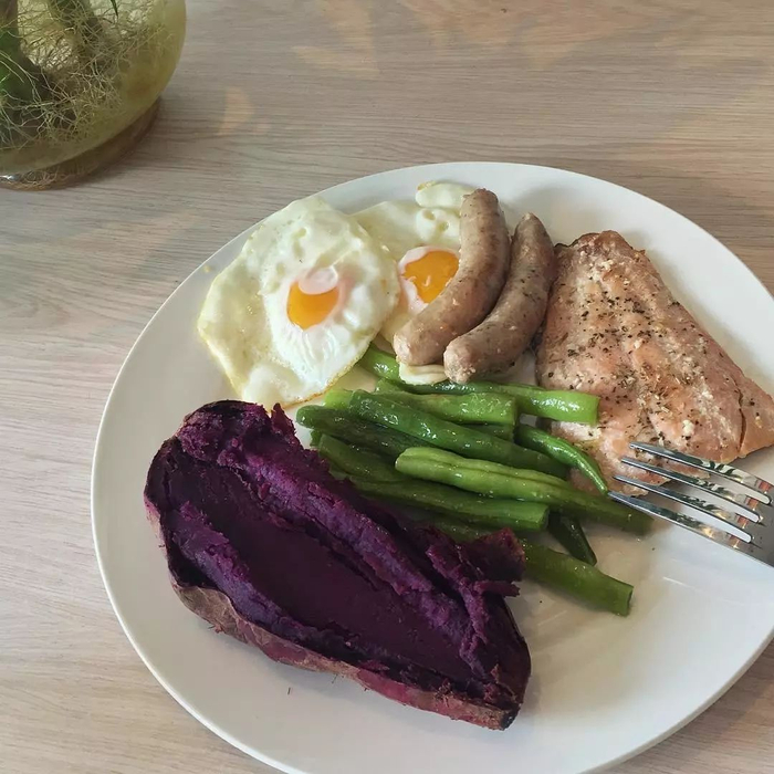 晚餐而言,有时候我晚上也会去训练,也就是一天训练两次,我会把晚饭的主要碳水化合物来源改为米饭。有时候不训练了,会选择纤维高的地瓜。