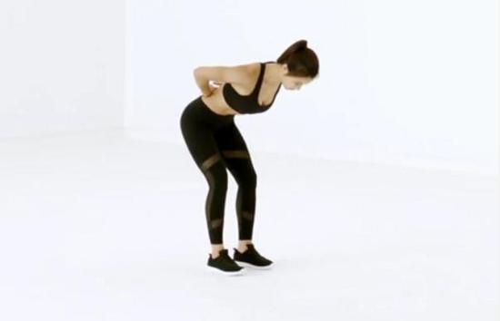 双腿打开,双腿可以轻微弯曲,双脚与肩同宽自然站立,上身挺直不要前伸,双手放于头部两侧,手臂朝两侧外向打开,双目平视前方。身体向前弯曲,注意这一过程中始终挺直背部,不要弓腰,臀部向后移动,向前弯腰至背部与地面大致呈水平方向即可,感受臀部和腹部的牵拉紧绷,每组15个,仅需1组即可。