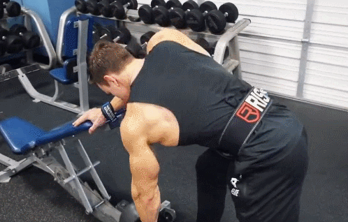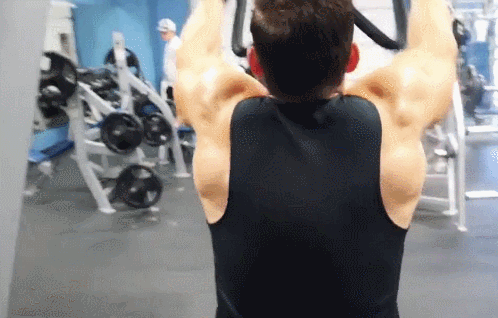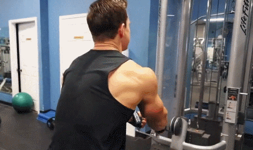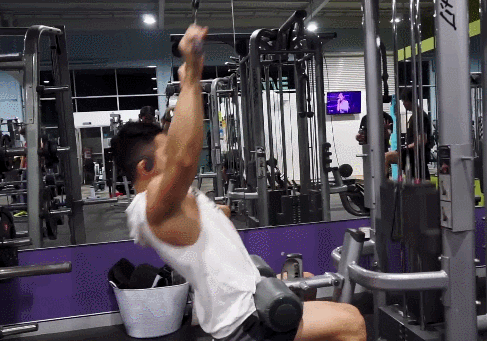 动作要领:这个动作是固定器械动作,不但可以练到背部肌肉,还能够对我们三角肌后束造成刺激,这个动作的注意事项就是我们的胸肌和腹部一定要一直贴紧椅背,不能够随动作的趋势而变动,那样则会造成动作刺激偏移。