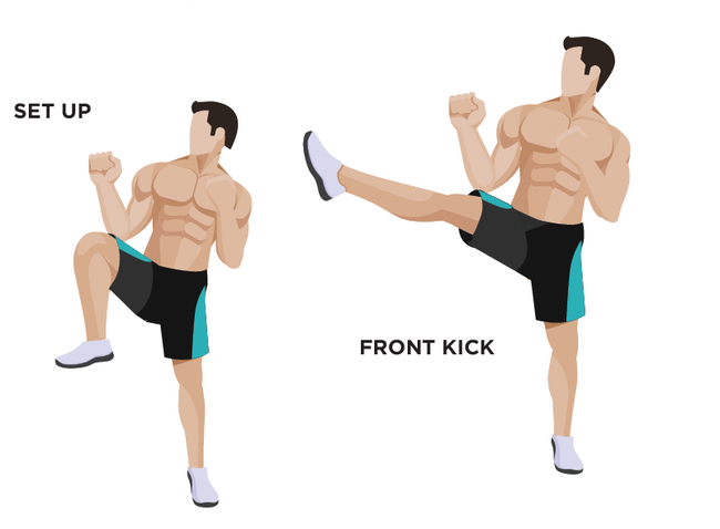 Movement: With hips square to front, lift one knee straight up toward chest. Extend knee to kick forward, aiming with ball of foot. Base foot is slightly turned out.