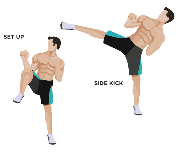 - 动作全程非出拳侧的拳头处于下巴处。踢腿时抬起手臂以保持平衡。