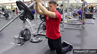 2。 双膝跪地双手抓握杠铃杆的一端,手肘弯曲,把杠铃收在胸前。。