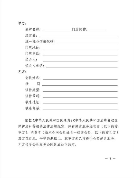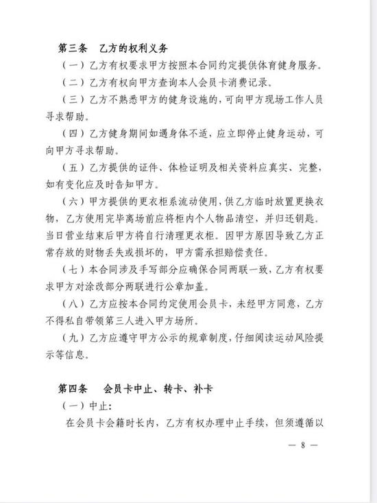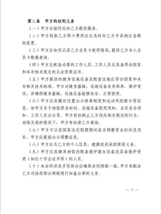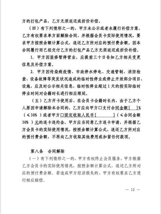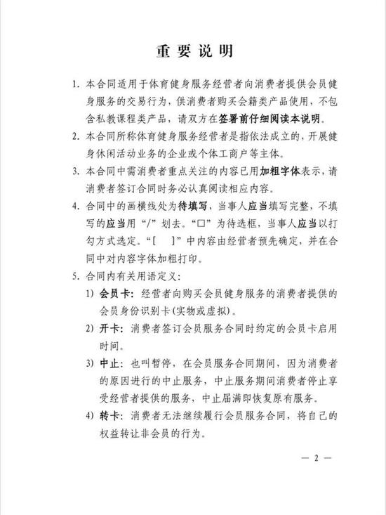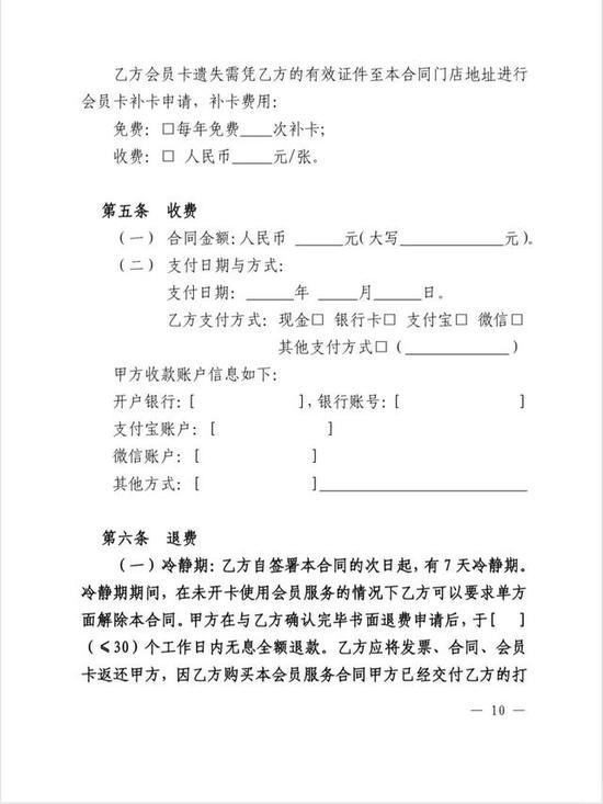 “退卡难、退费难”是健身行业预付费消费的两大痛点。对此,《合同(征求意见稿)》对违约责任、合同解除作出了详细的规定,明确了双方的权责关系。在第七条“违约责任”中,明确提出因经营者违约,发生擅自变更会员服务内容、终止营业、搬迁且未履行补偿方案、暂停营业且未履行补偿方案等四种情形,消费者有权单方面解除合同并获得相应退款。同时,《合同(征求意见稿)》对余额计算、退费期限做了明确约定,规范引导健身服务经营者,也使消费者的会员卡退费有章可循。