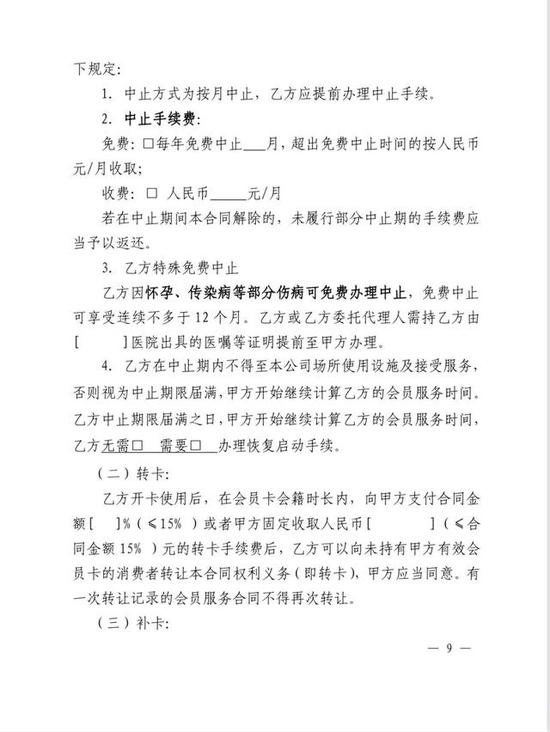 针对另一类消费投诉中常见的,会员主动申请解除正常履行的合同,但是对退卡手续费不满意的情况,《合同(征求意见稿)》根据消费者的解约原由将其细分为违约和合同解除两种情况:一是消费者因工作调动、出国等个人原因申请解除合同,视作违约,消费者可能要支付不超过合同金额30%的违约金;二是消费者因病、因伤残在会员卡有效期内都不适合继续健身,并按经营者要求提供医嘱证明或报告的,合同解除后可以退还未使用部分的预付费余额,无须承担手续费。此外,《合同(征求意见稿)》就女性会员怀孕期间免费中止(暂停使用)、消费者付费向第三方转卡等情形约定了收费(免费)细节,为妥善处理消费纠纷提供了依据。