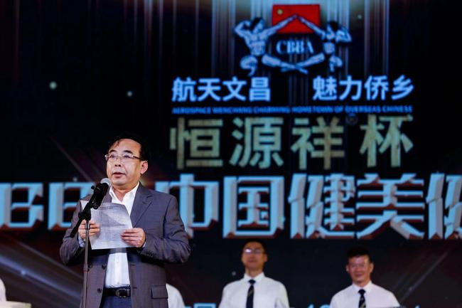 文昌市委常委常务副市长郑有雷为赛事致开幕辞, 亚洲健身健美联合会主席、中国健美协会主席张海峰代表中国健美协会,向恒源祥(集团)有限公司创始人、擘雅集团董事长刘瑞旗授予恒源祥企业特别贡献奖。