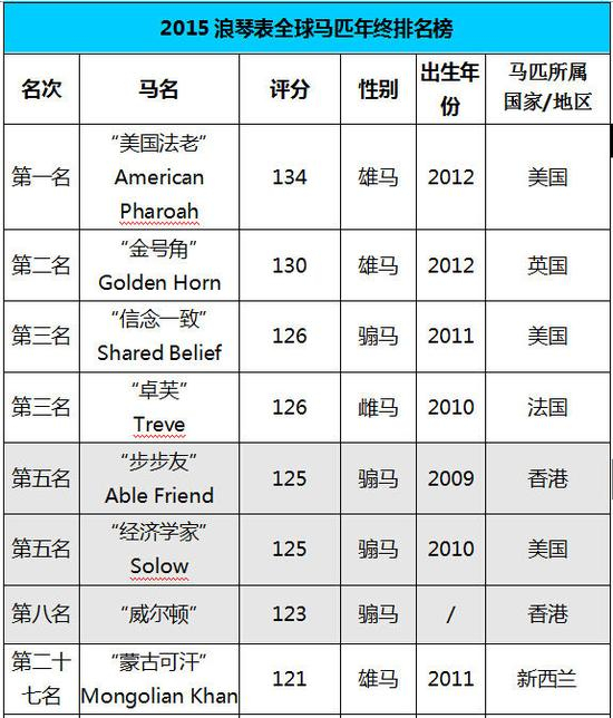 2015法国凯旋门大赛冠军、英国名将“金号角”以130分排名第二。圣雅尼塔让赛冠军“信念一致”及全球最佳雌马“卓芙”并列第三,皆获评126分。香港马王“步步友”、女皇安妮锦标冠军“经济学家”则以125分排名第五。香港另一顶级赛驹“威尔顿”则以123分排名第八。