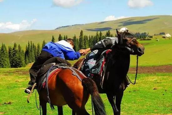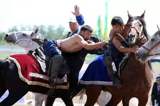 马上摔跤又被称为马上角力,是哈萨克族的传统马术竞赛技项目,流行于我国游牧民族聚集的草原地区。摔跤一般都在地面上进行,但哈萨克族还有马上摔跤。此项运动相传源于古代作战时马上擒拿敌人,至今仍受人们喜爱。参加比赛的两个人分别骑在马背上,先落下马背的一方为负。马上角力实行淘汰制,胜者可连续比赛。