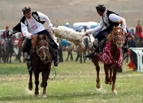 叼羊是哈萨克族一种对抗性强、争夺剧烈的运动。一般都在节庆或表演时进行。有分队和不分队两种形式。叼羊一般分三种比赛方式:第一种方式是分组叼,被叼的羊要预先割掉头,扒掉内脏,放在场地中间。参赛者10人左右为一组。主持者一声令下,两队骑手急驰而去,马快且马上功夫好者把羊抄起提着夹在蹬带下或驮着,不择路地奔跑,其他人催骑追赶抢夺。经过反复的互相争夺,当某队最后把羊放到指定地点时,就算获胜。第二种方式是两人单叼,由两个代表不同单位的单骑者将羊抄起开始叼夺,或者由另一个人拿起羊,让两个单骑去抓,发出号令后开始叼夺。经过两人奋力在马上拉扯争抢,谁最后夺到羊,谁就为胜。第三种方式是群叼,骑手不分队,多人策马争夺,以最后夺得羊并放到指定地点者为胜。