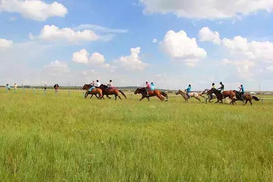 蒙古高原盛产著名的蒙古马,能跑善战、耐力极强。自古以来,蒙古人对马就有特殊的感情,蒙古人从小就在马背上长大,都以自己有一匹善跑的快马感到自豪。驯练烈马,精骑善射是蒙古族牧民的绝技。蒙古族赛马不分男女老少均可参加。少则几十人,多则上百人,一起上阵,直线赛跑,其距离40、60、80里不等。为了减少马的负荷量,不论老少,大都不备马鞍、不穿靴袜,只着华丽彩衣配上长长彩带,襟飘带舞,显得格外英武。