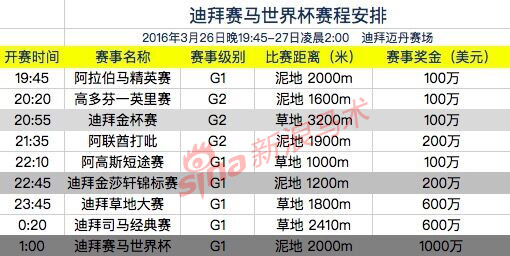 北京时间2016年3月26日,世界上最昂贵的比赛“迪拜赛马世界杯”将于迪拜迈丹赛马场点燃战火。这项赛事始于1996年,比赛的全部奖金均由阿联酋王室提供。最高的单场比赛奖金达1000万美元,头马可获得其中的600万,因此每年都吸引着全球各路顶级良驹和骑师展开争夺,非常令人期待。赛事临近,具体比赛安排公布如下: