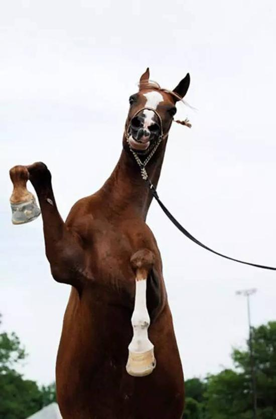 马在受惊时,两前肢会向两边张开,并且身体会微微后倾,这表示可能下一秒它就会逃跑或窜出去。