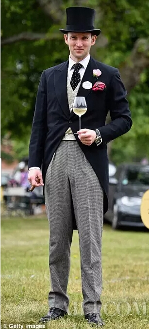 在 这场盛大的赛马会上,变身英伦绅士的第一步,是要搞清楚你会身处哪一个包厢。赛马会的观赛区域可分为皇家场地、大看台和银色包厢,不同的区域对应不同的着 装规定。而如果你有幸入座皇室场地,那就意味着比邻英国女王,所以对着装也有最严格的要求。而这一整套男士着装礼仪,我们可以用“晨礼服”一词来加以概括。