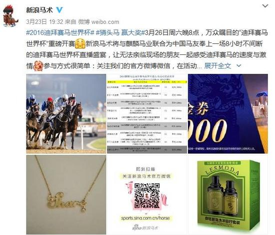 为了让更多国人感受“赛马”的魅力,新浪马术已多次携手世界顶级赛事,绞尽脑汁把每场直播做的很好玩儿。今年3月,新浪马术在中国大陆独家直播迪拜赛马世界杯,9场#猜头马 赢大奖#互动让网友们玩儿疯了,也创造了自频道创建以来的赛事直播观赛纪录。