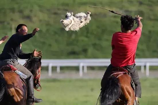 哈萨克族的传统节目——叼羊赛可谓草原马节的一个标配。叼羊是中亚地区众多游牧民族的一项最传统的、老百姓最喜闻乐见的一项娱乐活动,同时也是一项竞技活动。各地区会略有差异,不过都对参赛马匹和人不设任何限制,赛事唯一的规则就是只抢一匹羊。据说哈萨克斯坦有一次叼羊活动,从7儿童到70多岁老人,总共有5000多人同时参与。草原上的哈萨克牧民每隔两三天就会举办一次叼羊比赛,通常为庆祝婚礼和男孩女孩的成人礼(哈萨克族男孩到了五六岁便会举办成人礼,形式为割礼,即剥皮;女孩是八九岁,形式为穿耳洞)。不过即便是没有这样的理由,抢到羊的哈萨克族人在“收拾了”这战利品之后,过三天便要提供一头活羊来继续叼羊赛。