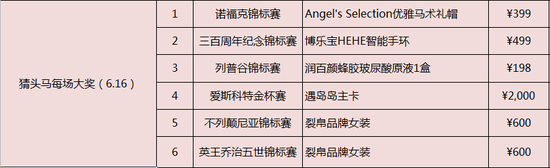 第二重大奖:猜头马每场大奖,奖品清单如下。