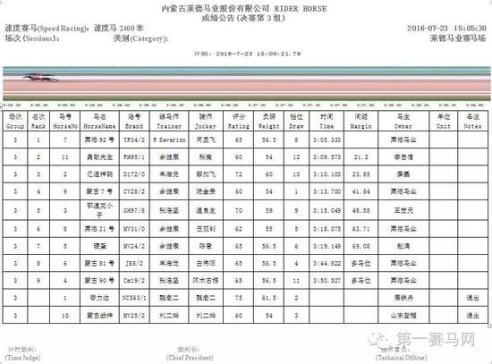 第三场2400米比赛可谓峰回路转,多匹赛马在途程争锋反超镜头十分精彩。比赛出闸后,马匹基本采取留力策略,守住自己的的位置。在进入第二个弯道的时候所有赛马开始发力出击,多次反超势要拼个你死我活,最终莱德马业的“莱德92号”力压“勇敢先生”,夺得本场赛事的头马。李忠信的“勇敢先生”是第二名,秦磊的“亿通神驹”是第三名。