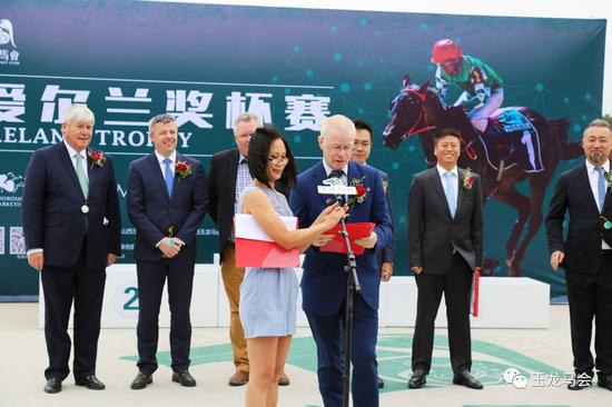首先由爱尔兰驻华使馆农业参赞科隆致辞。科隆先生首先对爱尔兰纯血赛马业与中国赛马业的合作成果表示肯定,赞赏张月胜先生的不懈努力使得爱尔兰优秀的纯血马系来到中国,同时也对新加坡赛马俱乐部团队对于玉龙赛事的协助表示感谢。今天来自爱尔兰的高福斯拍卖行、红磨坊马粮、库摩育马场、爱尔兰赛马会纯血马事务部等赞助商代表来到现场,目睹了玉龙国际赛马公开赛的成功举办,期待未来爱尔兰纯血赛马业与中国赛马业携手共进,迎来更美好的明天!