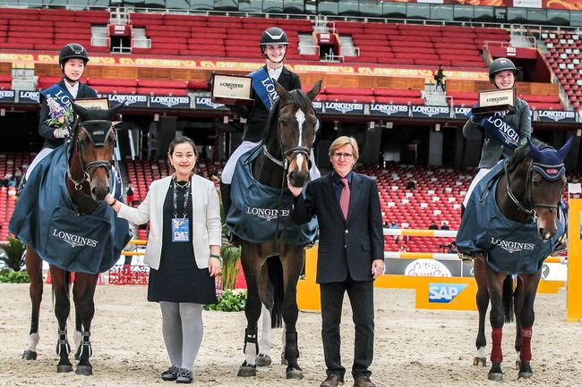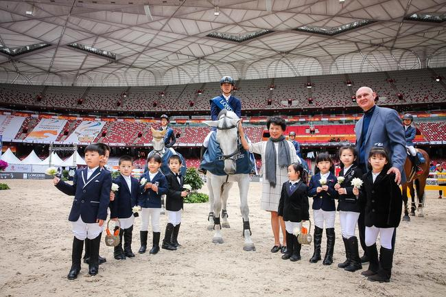 随后进行的是团体冠军赛决赛(120-125cm),来自全国的13支俱乐部代表队各选派3对人马组合角逐团体冠军。昨天预赛后,各个俱乐部积极调整战术备战。比赛精彩纷呈,分数你追我赶,最终第一名桂冠被多美马术俱乐部摘得, 第二名获胜团队是天星调良俱乐部,第三名则由青奥马术俱乐部获得。本届大师赛吉祥物,可爱小马“星仔”也作为特别嘉宾参与颁奖环节。冠军团队不仅获得奖金、奖杯,还将获得浪琴表提供的骑仕系列腕表。最后,冠军团队骑马绕场一周,接受观众们的振臂高呼。