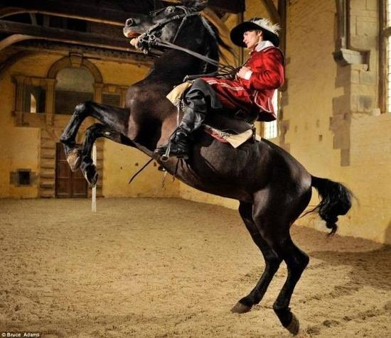 下图为博尔索弗城堡中,6岁的安达卢西亚马“奥克勒”正在阿特金森的指导下进行舞步练习。