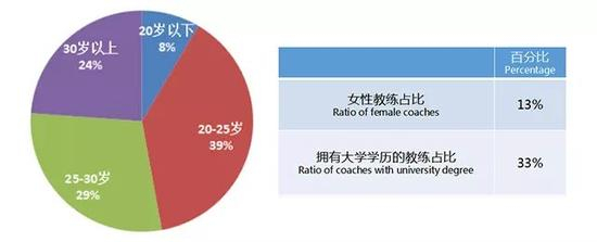 调研数据显示每家俱乐部平均拥有教练7.71人,其中女性教练占比13%,拥有大学学历的教练占比33%。