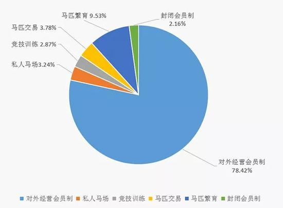 受访俱乐部对外经营会员制占78.42%,私人马场占3.24%,封闭式会员制占2.16%,马匹繁育占9.53%,马匹交易占3.78%,竞技训练占2.87%。