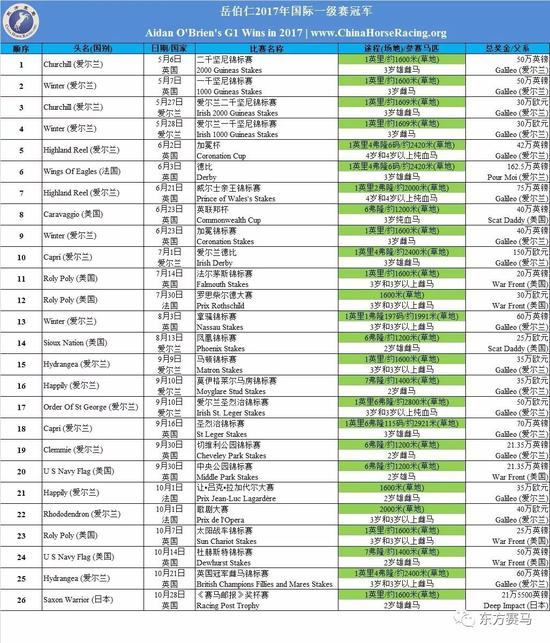 10月28日,爱尔兰练马师岳伯仁(Aidan O‘Brien)训练的2岁雄马‘英国斗士*’(Saxon Warrior)赢得一级赛《赛马邮报》奖杯赛(Racing Post Trophy),这也是今年岳伯仁所训马匹的第26个国际一级赛冠军,打破了美国练马师范高尔(Bobby Frankel,2009年去世)在2003年创造的世界纪录(25个)。